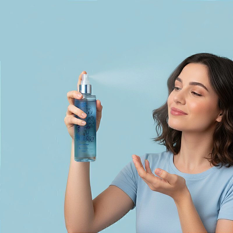 Borrife sobre a pele limpa, focando em pontos estratégicos como pescoço, pulsos e braços.